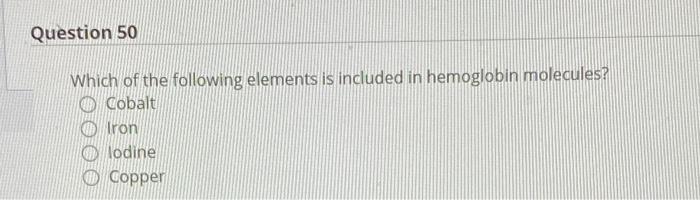 1Proteins 2Carbohydrates 3Trace elements 4All of the molecules listed are. 65 Which of the following elements is included in hemoglobin molecules A Cobalt from SCI 335 at Wilmington University. O Cobalt O Copper O Iron O lodine O Calcium QUESTION 3 A primary function of lymphocytes is to 0 phagocytize damaged cells.